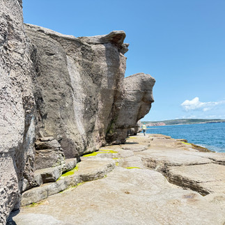 The cliffs were pretty – not as spectacular as others we'd experienced on this trip – but the rock formations were very different. We really enjoyed the cove-cave we found at the end of the trail. The water was crystal clear, and the rock formations were fascinating, with huge boulders balanced on top of each other. Some looked so precarious they might roll off any second!