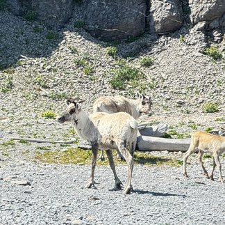 During one of our rock-hopping adventures, we found ourselves in a fairly large bowl-shaped area of stone. Looking up toward the rim, we spotted them: two adult caribou and one calf! We sat perfectly still, enjoying the distant view, when something amazing happened. To our complete amazement, they came down into our rocky bowl and passed right by us!
